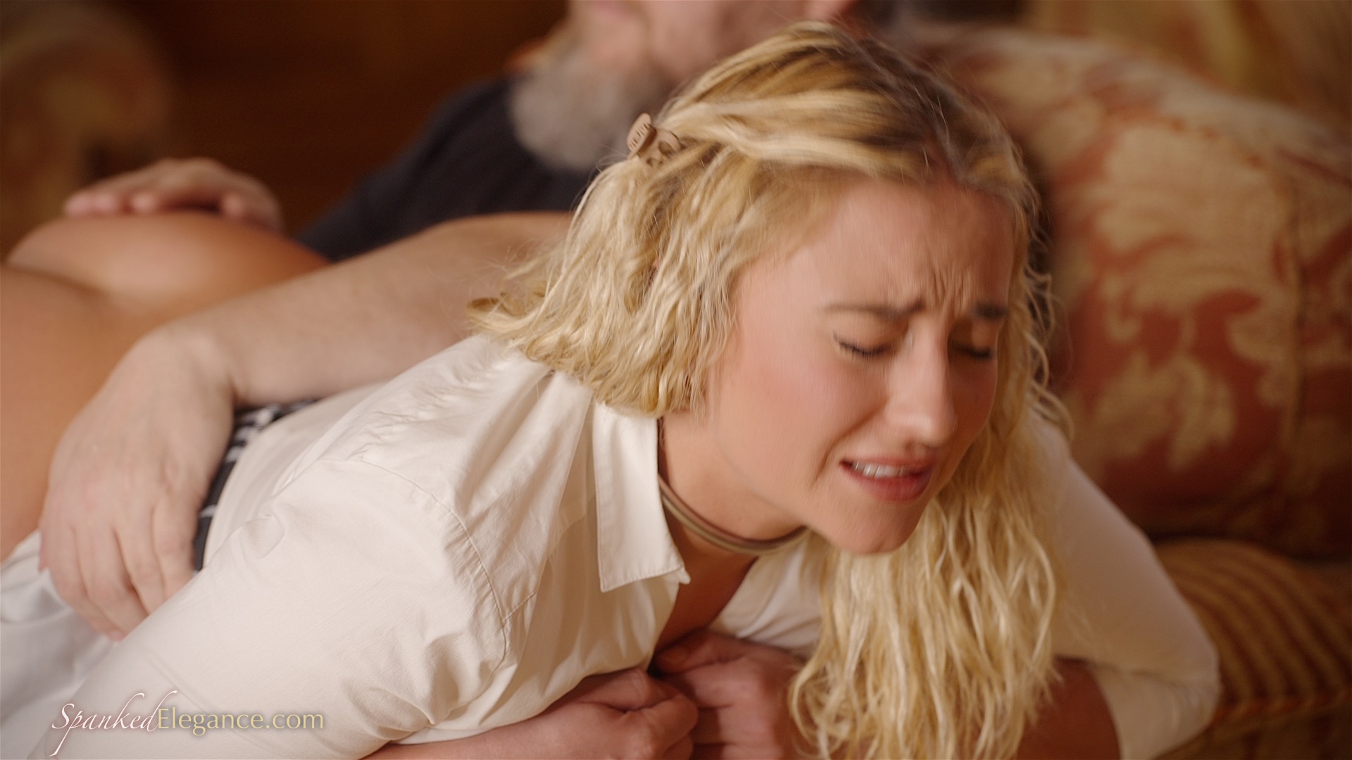 Of course, she chooses the punishment – she cannot afford to get expelled! She is dressed in her regulation uniform of a short tartan skirt and a white blouse. She is shown in to the disciplinarian’s study, where he explains to her what her punishment is to be. First she must stand in front of him and take her panties down to her knees. She stands humiliated for a while before he orders her to go over his knee. He then administers a painful and prolonged hand spanking. She kicks with her legs and bare feet and squirms under the blows, but he holds her down tight.
